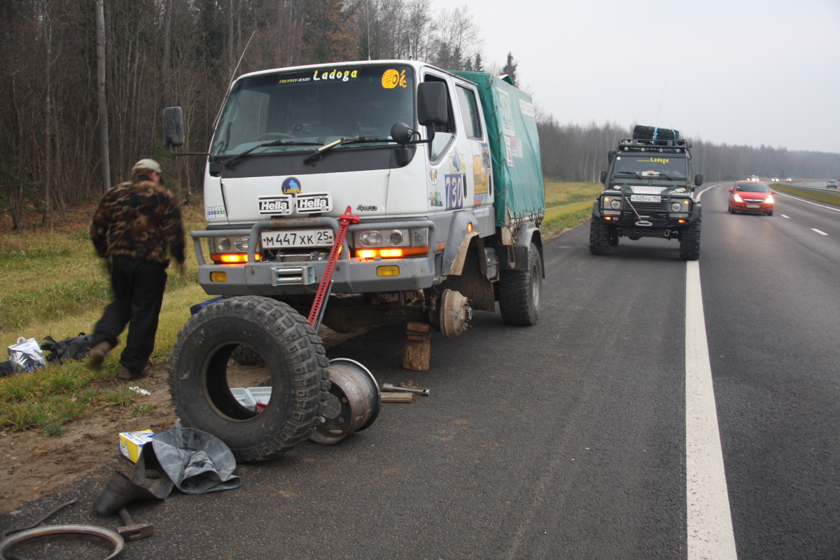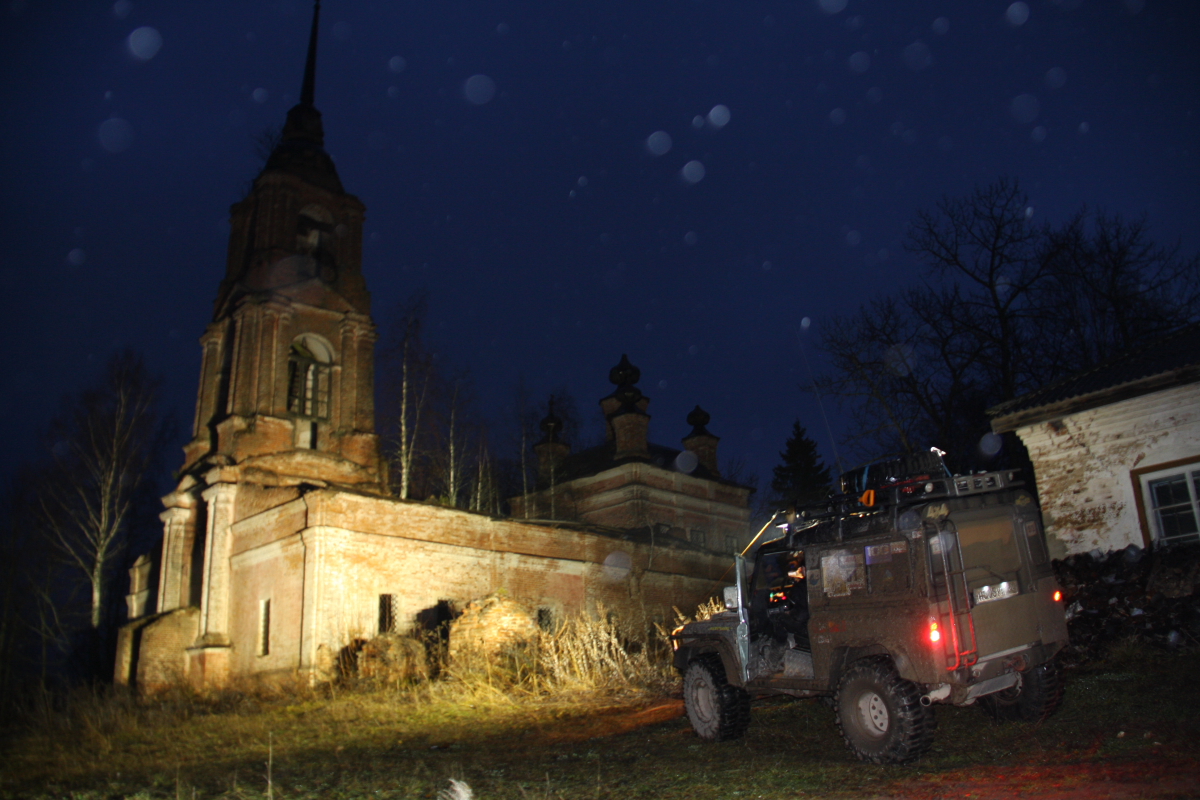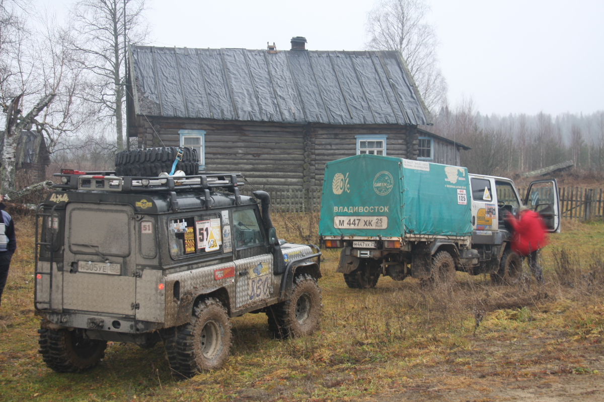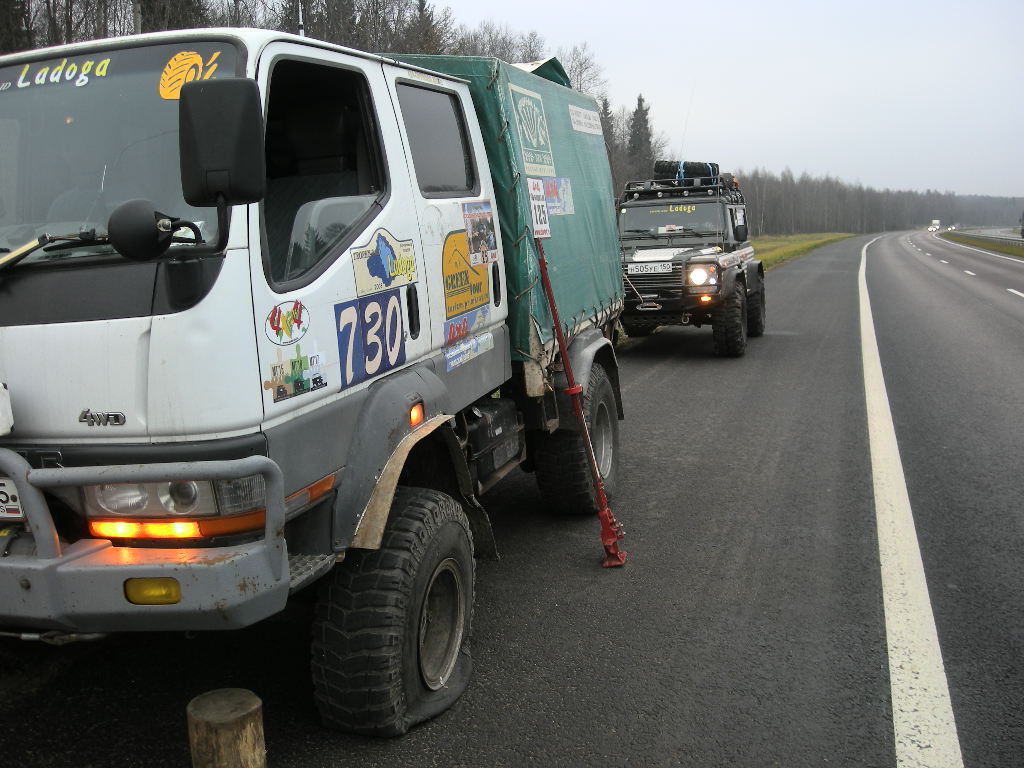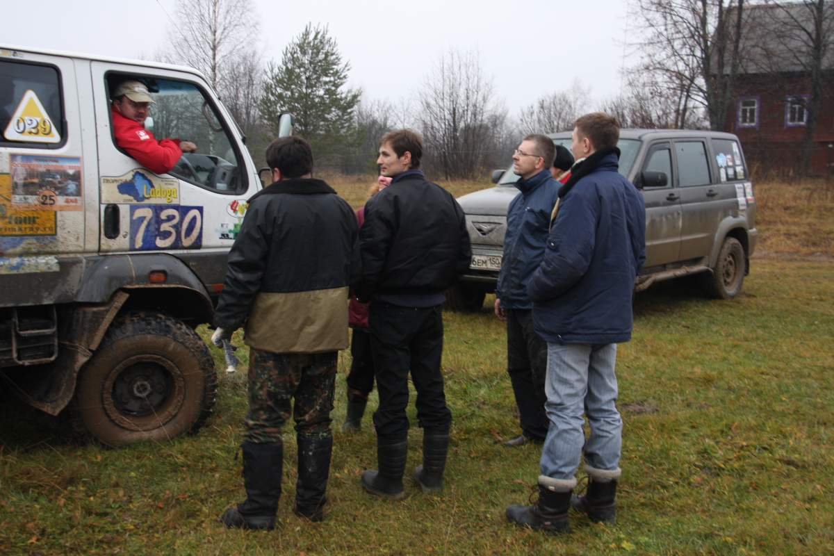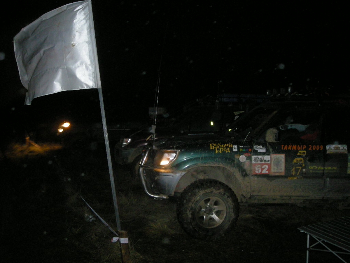 Встретившись с Пилотом на Ярославском шоссе, наскоро перекусив ( пока ждали Пилота я отстоял двадцать минут в ресторане быстрого питания, и уже у кассы, заказав, ожидая свой кофий и бутерсендвичи,мне на плече как в фильме « Операция Ы» легла твердая рука… Дима успел сделать заказ!) ,мы отправились в дорогу… Кантер вызывает такой интерес у всех участников движения что око зависти накрыло нас через час пути, злые силы поселились в левом переднем колесе и два раза напоминали нам о себе… Опыт Олега и огромный энтузиазм Рамиса, а так же помощь от экипажа Пилота не оставили шансов демонам, как мы думали меняя второй раз вечером злополучное колесо… но видимо мантра была прочитана не до конца , изгнанные злые силы переселились в правое заднее … Вообще скучать по дороге не пришлось. Встали ночью рядом с Чухломой, мимо нас проезжали такие же искатели на разных внедорожниках стремясь в точку сбора ,сигналя нам , пролетела шишига с флагом , как мы позже узнали это ребята из Костромы ехали прокатывать зимник «Сусанин трофи» . Машин десять, пятнадцать проехало за те два часа пока мы меняли третье колесо за день, все сигналили, приветствуя нас видимо подбадривая наш шиномантаж в ночи , и только маленький « Джимик» остановился и предложил помощь… спасибо тебе добрый человек!!.. К точке первого лагеря добрались к часу ночи , нас радушно встретили чухорги ,выдали номера , сувенирные кепки, и книгу о ПЧ 2010 ( они сами собрали материал и довольно интересно описали те места по которым нам предстояло двигаться три дня), было приятно! , чухорги ,как старых друзей окружили заботой , объяснив структуру лагеря ( туда не ходи, сюда ходи… тут дети и собаки ,там шум и веселье..) . Выбрав место на поле, поставив палатки, мы еще долго , (видимо уже подкатывал адреналин) сидели, пили чай, обсуждая предстоящую дорогу читая вслух из книги ПЧ2010, поминали демонов проколовших нам за день три колеса!!! ,твердо решив встать уже сегодня в восемь, легли в четыре…