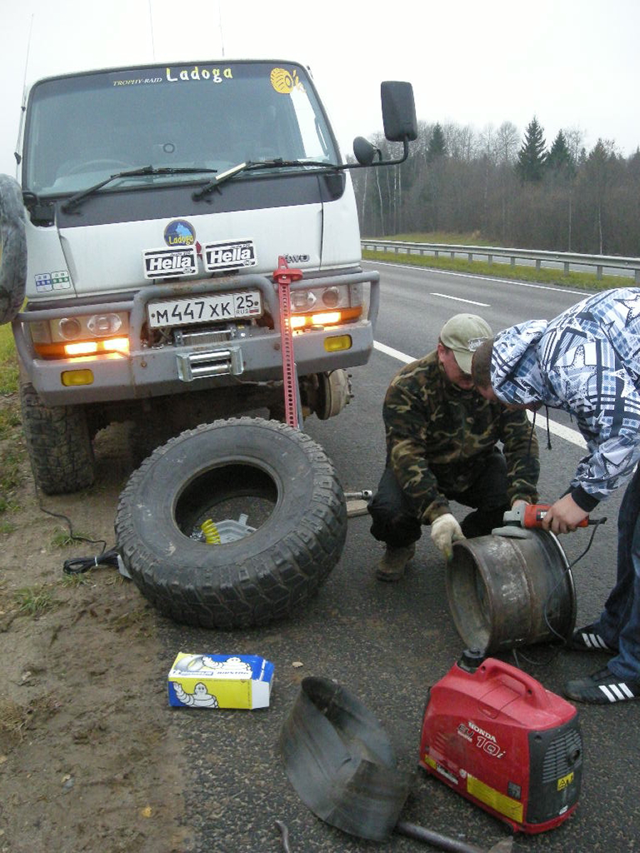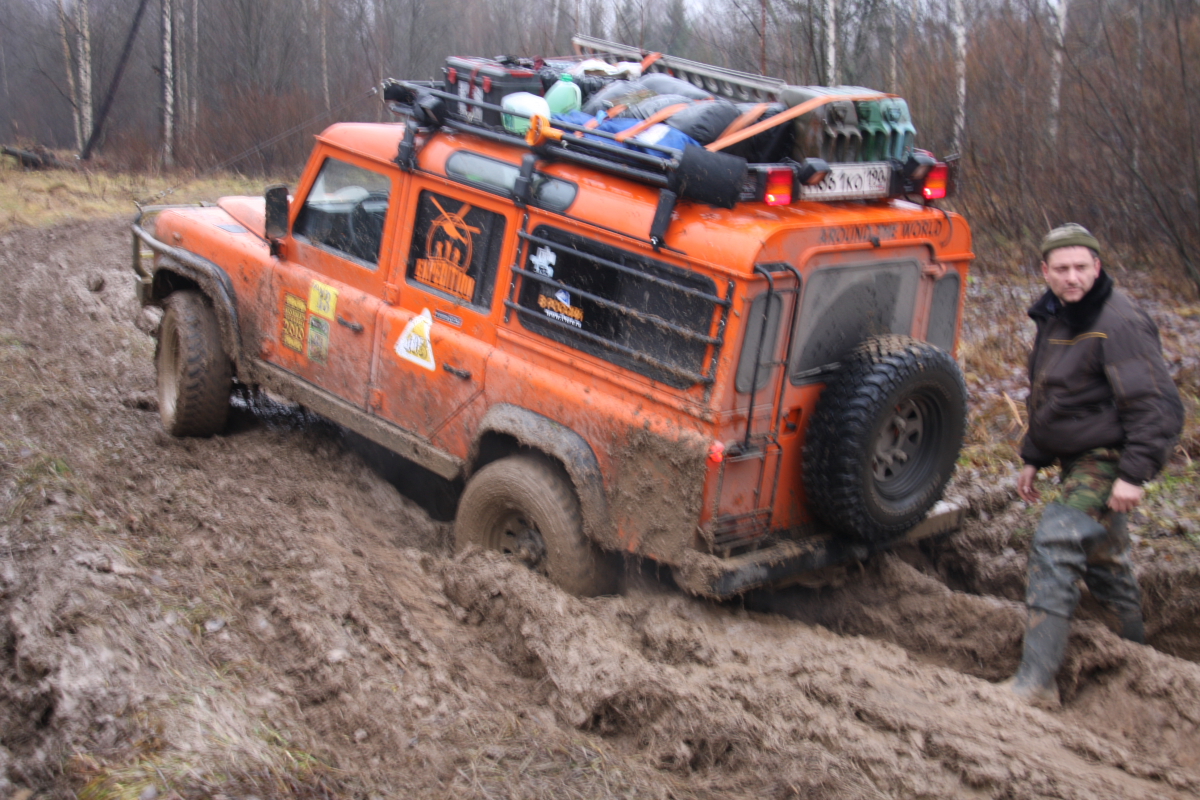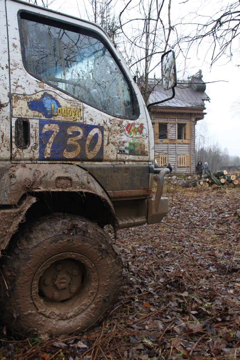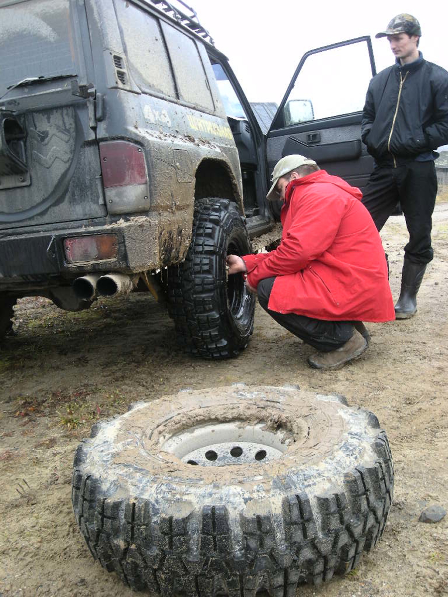 Проехав из лагеря меньше километра у наших новых друзей из Костромы спустило колесо…. Демоны которых я выгнал …поселились рядом… Олег ( наш) немог остановиться, поменяв вчера три колеса за день он и сегодня решил начать день с этого и ринулся помогать, устранив неполадку мы пропустили много команд Геоджиперов ,которые учудили пробку и задержали нас ,тут то мы решив их объехать и сели первый раз, то есть коротыши проехали ,а наш монстрик не захотел.. Добравшись к терему я увидел стандартный Прадо на цепях….. и пеших туристов, а говорят глушь…..