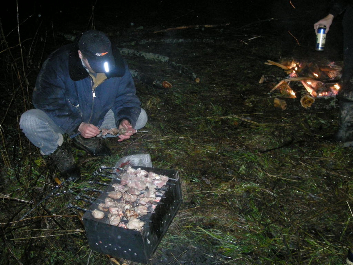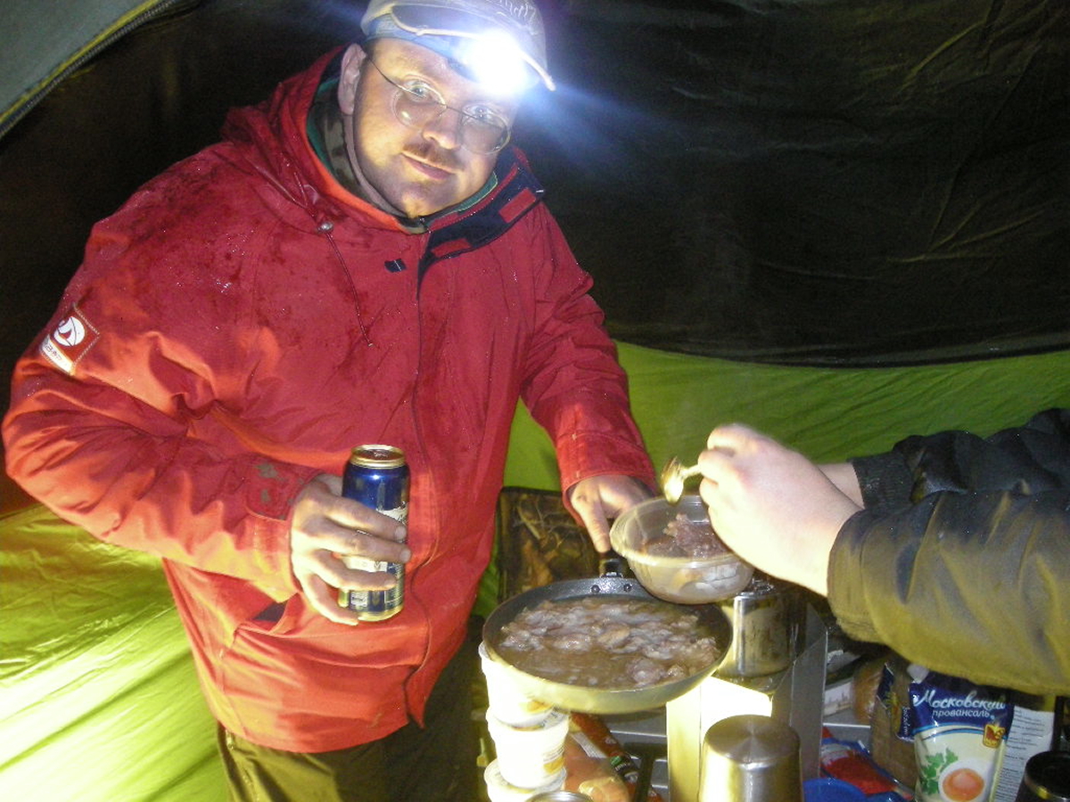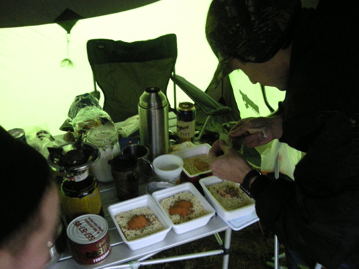 Появившись в лагере, экипаж сдает номерок, его утром выдали при выезде, орг пригласили всех в кинозал под открытым небом ( и так каждый день!) Супер ! с восьми вечера показывали короткие фильмы о путешествиях снятые самими участниками и присланные до поездки чухоргам,.. И тут всех удивил Пилот! У него был шашлык и мангал! Вообщем, пока ставили лагерь, разводили костер, Иван сделал нам шашлык! И мы неспешно вели разговоры у костра….