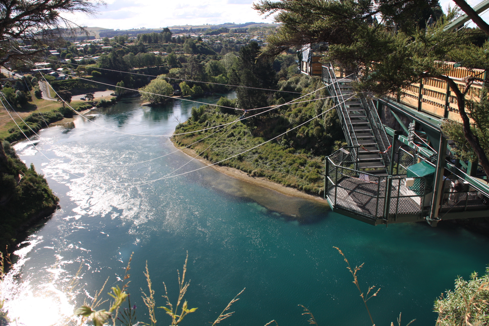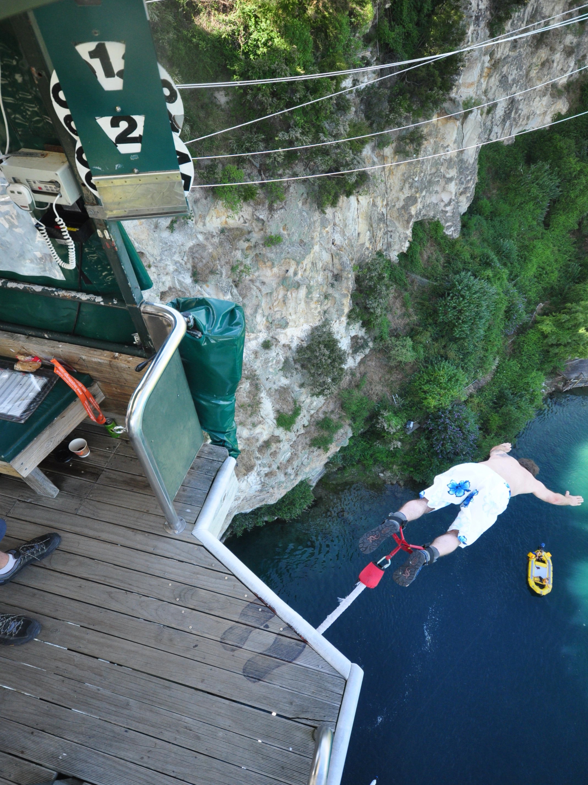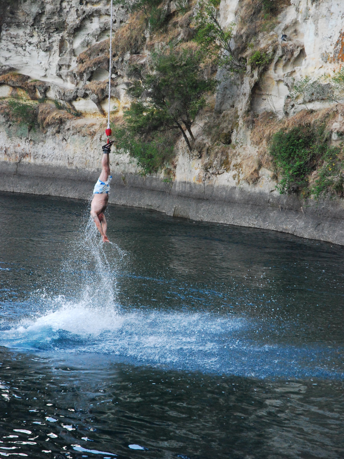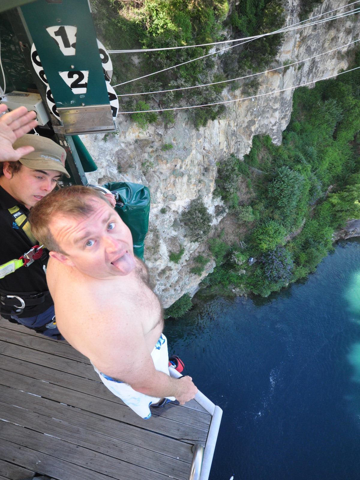 Второго января,решил прыгнуть!Новая Зеландия по заявлениям самих киви, держит первое место по экстриму в развлечениях, и побывать там не испытав полета с привязанными ногами нельзя( это же не руки за спиной связаны), тут это называют Банжи, у нас тарзанка. Вот доложу я вам 4 секунды полета,жаль памперсы не вадают...вроде с парашютом прыгал,или выталкали,сейчас не вспомню на дворе был 89 год, а тут в полном здравии и не совсем в уме,решил ! Деньги в кассу культуру в массы, узнав что я русский при заполнении анкеты (отказ от притензий и полный адрес.....на случай куда везти тело мрачно пошутил инструктор) они предложили вообще не привязывать канат к ногам.. мол русские знаем вас... На стенке конторы висела газета , статья гласила что дед 70 лет прыгает каждый свой день рождения, вот так! Высота 43 метра, головой в воду по желанию, я пожелал! что кричал когда шагнул НЕ помню,но помню что кричал.....
