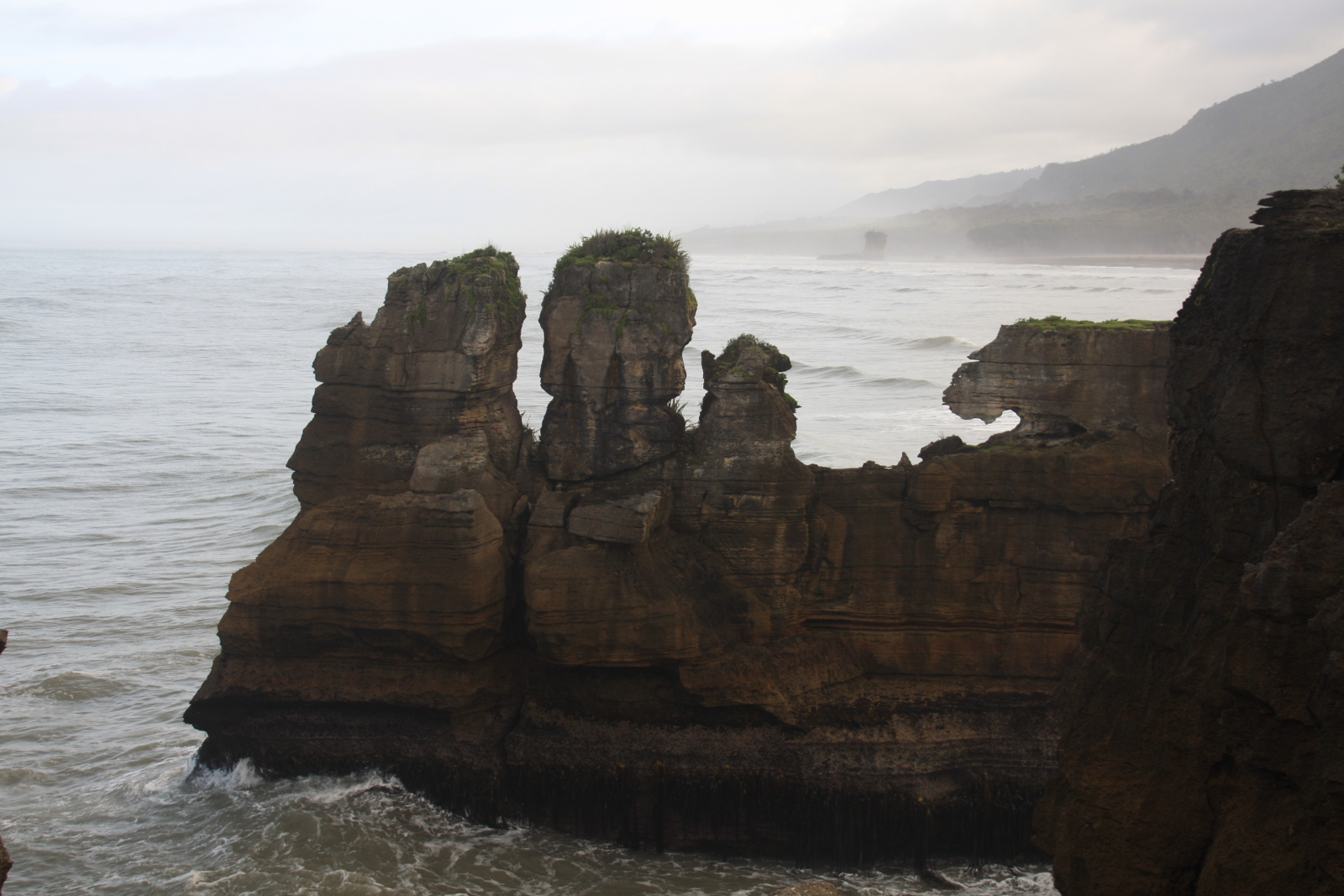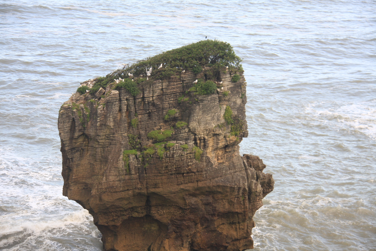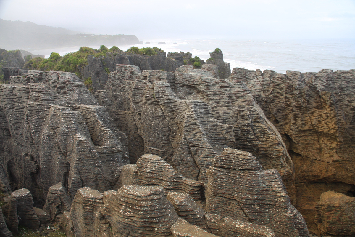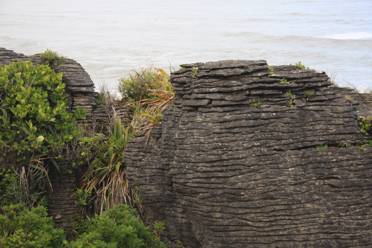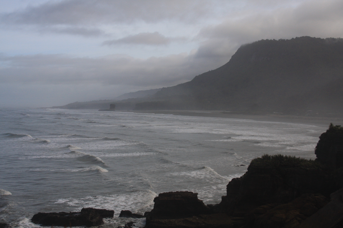 На Южном острове природа и климат меняется быстро ,вот только было солнце и тут за поворотом уже идет ливень,проехав пару десятков км вы можете попасть на пляж и загорать, а уже за соседней горой идет такой дождь и ветер что из машины выходить нет желания! Как нам сказали на западе острова дождь ИНОГДА не идет...но нам людям знакомым с Балтикой и Баренцевым морем это просто смешно. При температуре +9 на перевале и +18 у воды мы чувствовали себя прекрасно зная что в Москве -20! Наш путь лежал в национальный парк Папароа, там стоит посмотреть настоящее чудо природы блинчатые скалы или Пэнкейк-Рокс,океан,его огромные волны и ветер(дует всегда!) нагромоздил горы блинов! вид ! фото не может передать красоты и всей необычности этих камней!