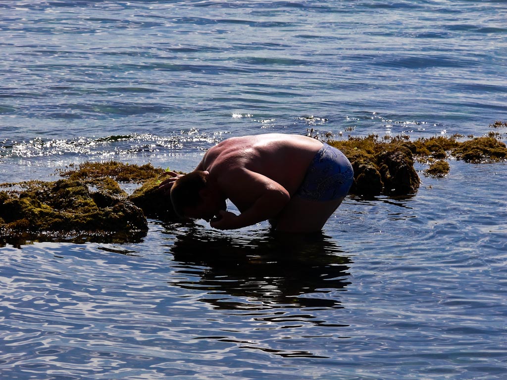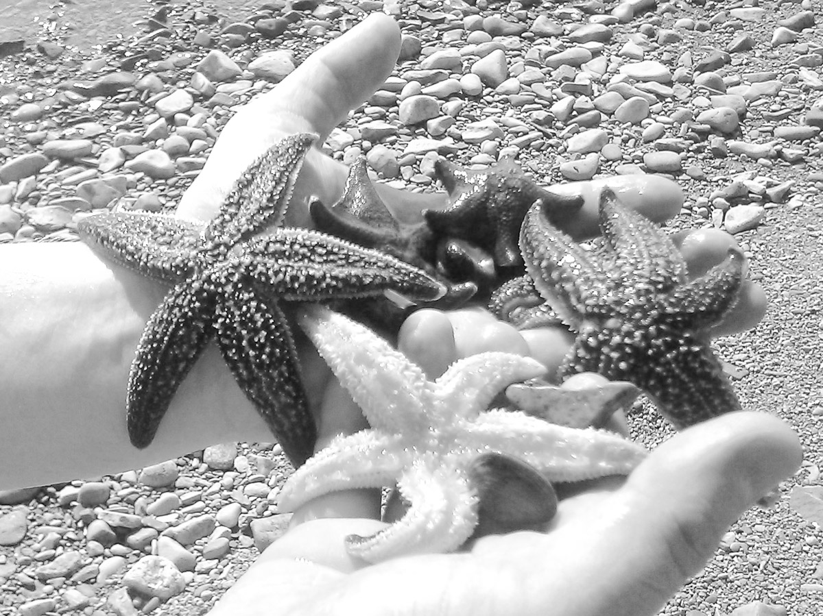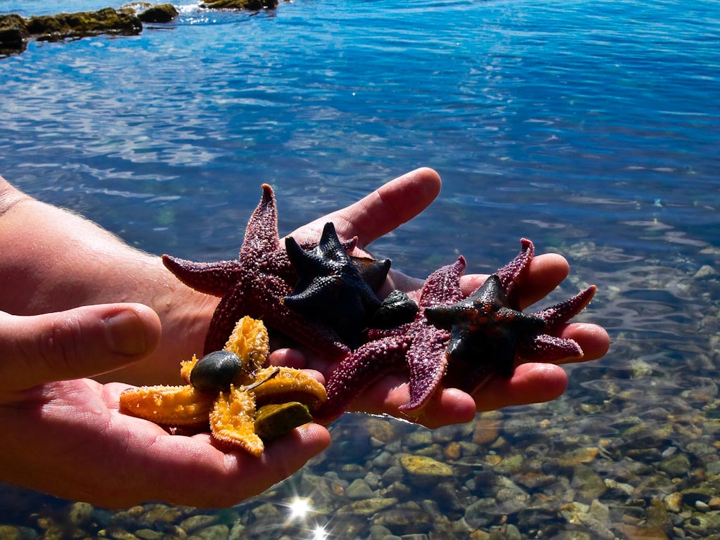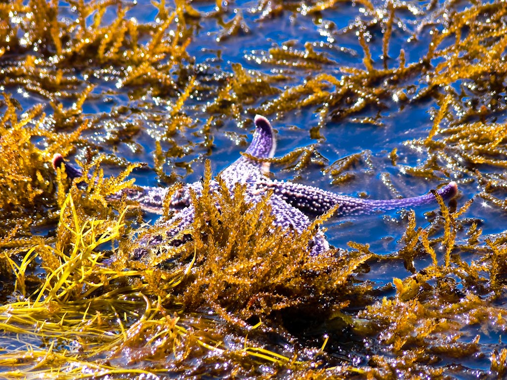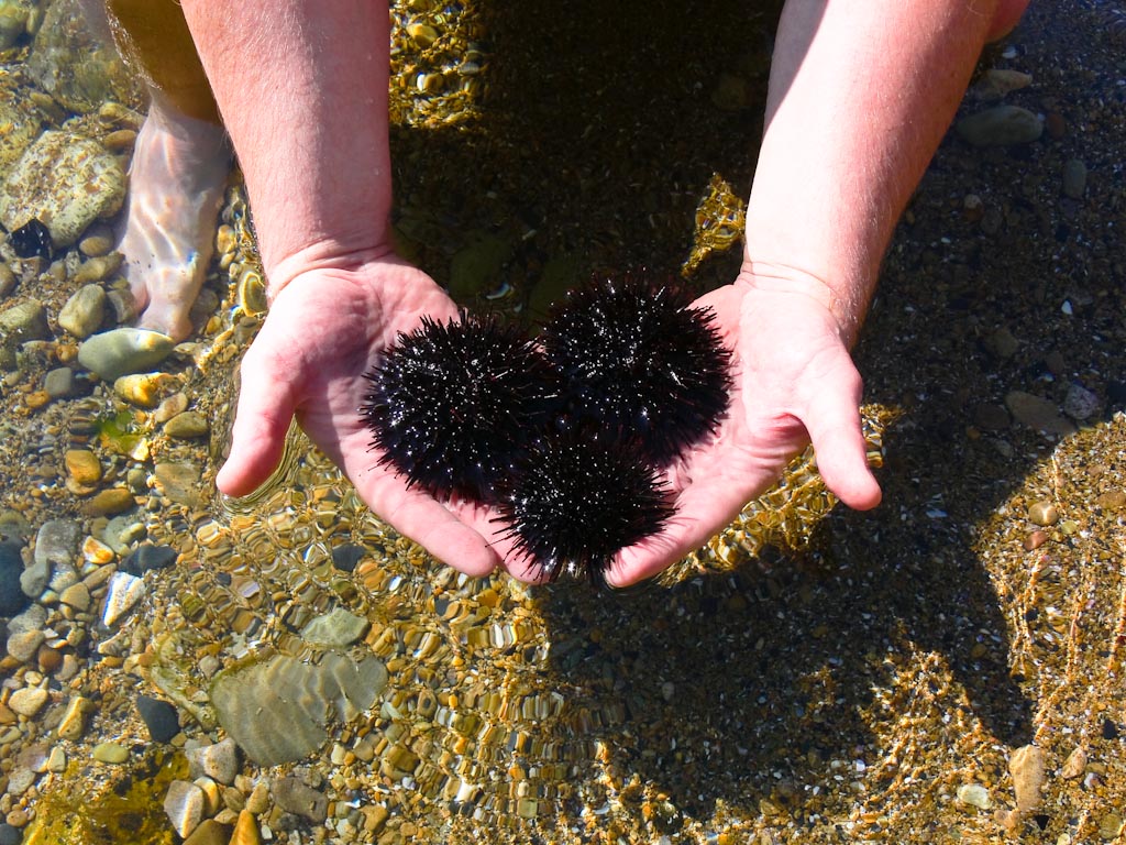 Сегодня был на море, совсем рядом с городом, тепло и вода чистейшая. Показатель чистоты воды - в 10 метрах от берега, на каменной отмели, глубина по колено - куча морских звезд, морских ежей и трепанга.