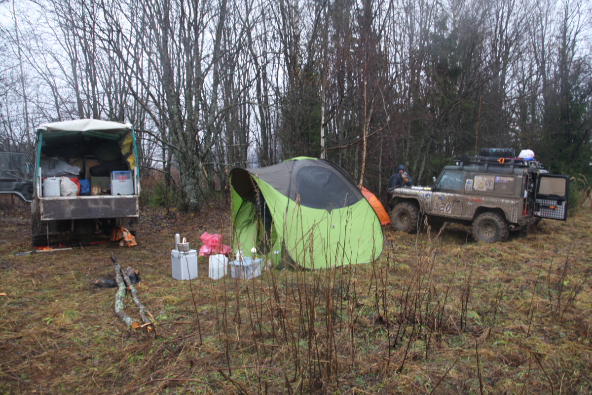Проснувшись рано утром , были приятно удивлены отсутствием дождя, как то за три дня привыкли ехать, ставить лагерь , смотреть кино у костра ,все под моросящим с разной силой мелким противным дождем… а тут ! солнце! Народ в лагере повеселел! Появилось еще больше собак и детей, налет важности с некоторых персонажей за два дня бездорожья слетел как незакрепленный груз с крыши…. И даже те ,кто вчера ночью приехал на буксире улыбались лежа под машинами чиня без мата своих монстров…, солнышко и легкий мороз, что еще надо в последний день Полной Чухломы?